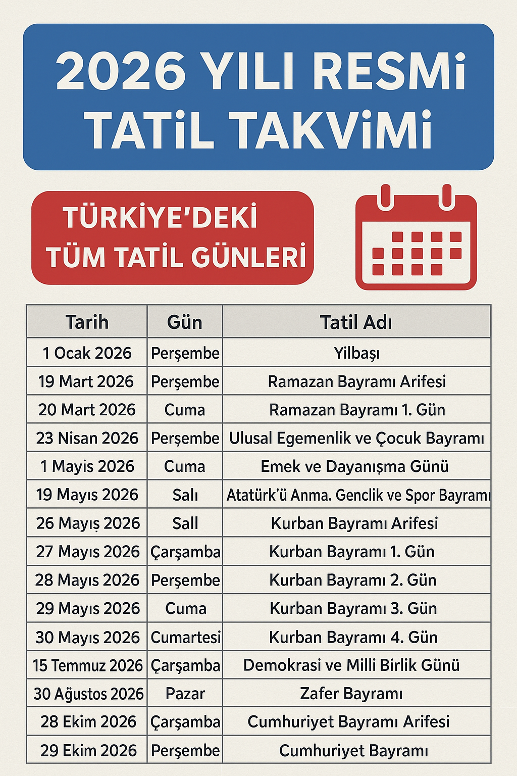 2026 yılına dair resmi tatil takvimi belli oldu. Türkiye’de çalışanlar, öğrenciler ve tatil planı yapanlar için en önemli konulardan biri, resmi tatillerin hangi günlere denk geldiği oluyor. Bu yazımızda 2026 yılı resmi tatil günlerini, milli ve dini bayramlarla birlikte detaylı şekilde listeledik.